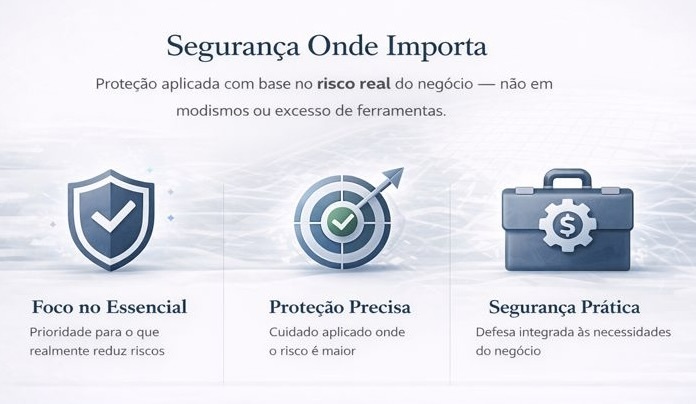 Proteção aplicada com base no risco real do negócio — não em modismos ou excesso de ferramentas.